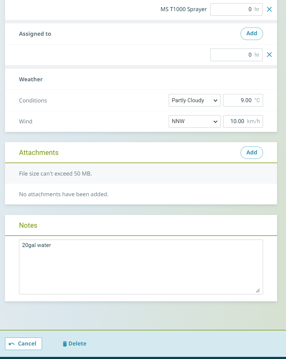 If using water as a carrier for a spraying activity, there is no way to record the water volume used - other than in the notes section... which is helpful, but does not prompt the operator to enter that information... or for planned activities.