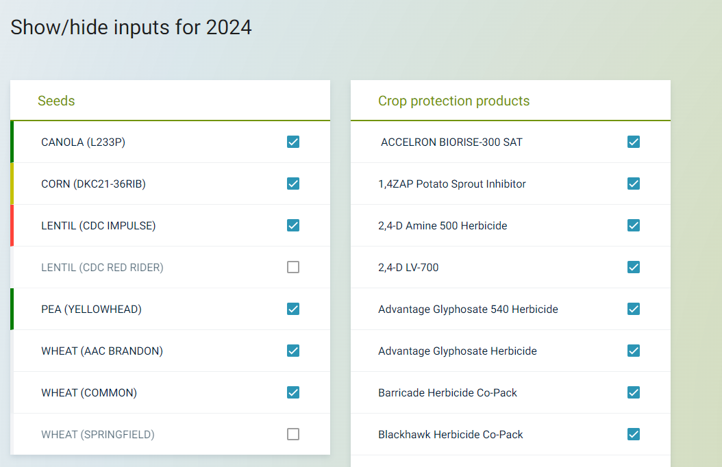 Hi, please let us know of any missing chemicals or seed treatments and we can quickly add those for you.You also can hide any seeds, fertilizers or Crop Protection Products that you may no longer need from year to year. Thank you!