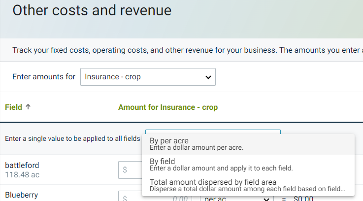 Hi, you can't add crop insurance per crop type, but there are a few options to make entry of crop insurance easier via Profitability > Other Costs & Revenue > Crop Insurance.